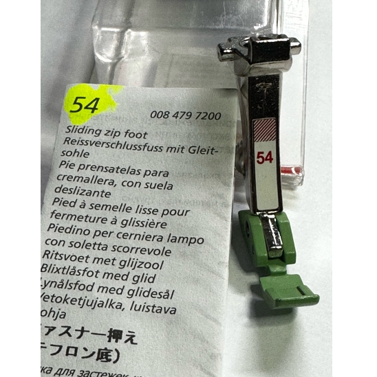 Just like Zipper foot #14 /14D, Zipper foot with non-stick sole #54 features an adjustable guide on the top of the foot.