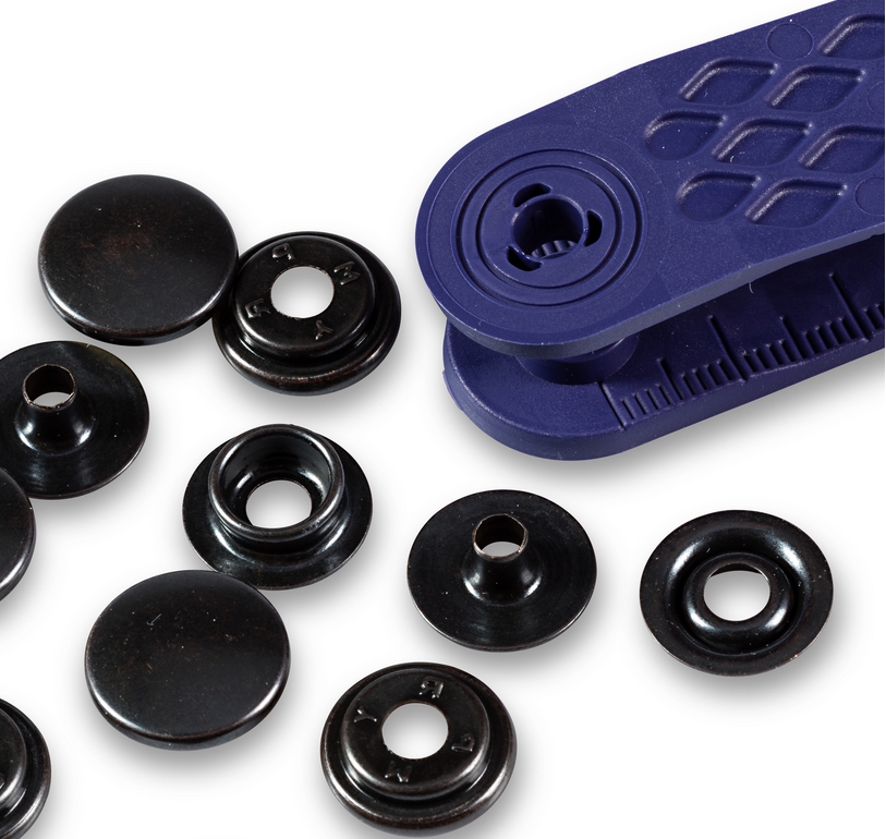 • Non-sew press fasteners for strong fabrics in the camping and sports areas