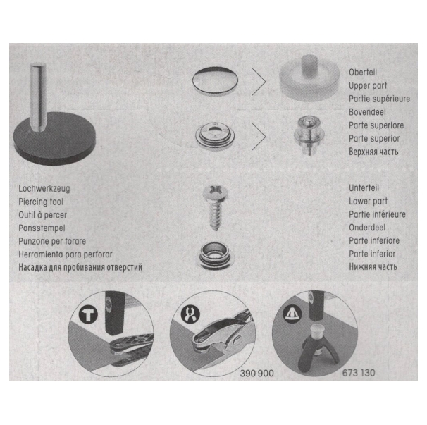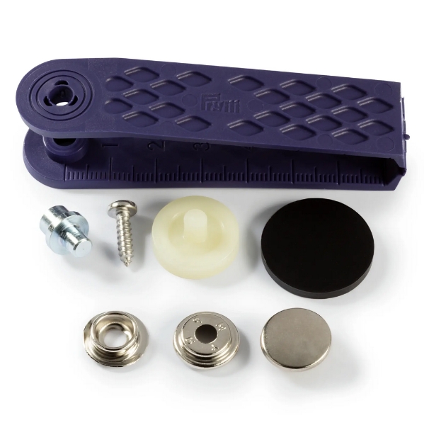 The tool for attachment to the fabric is included – the base of the press fastener is secured with a screw to the wood or similar material.