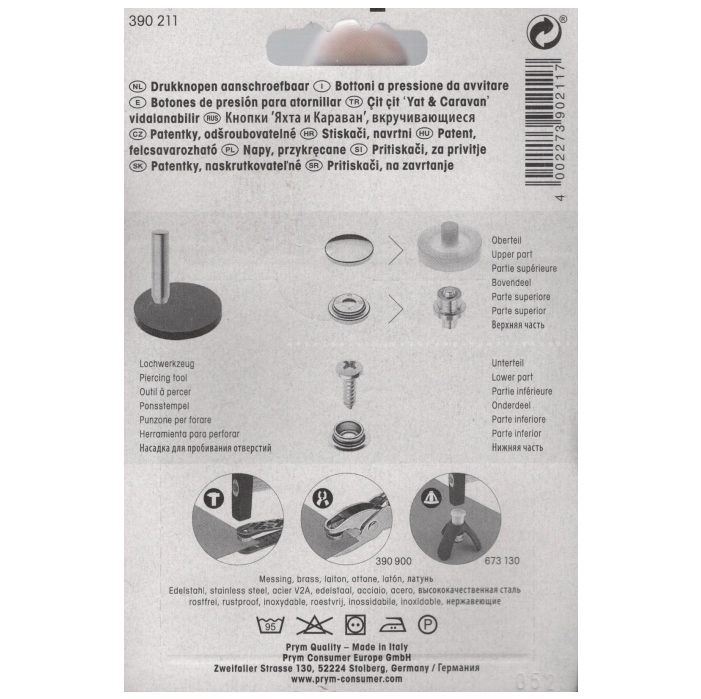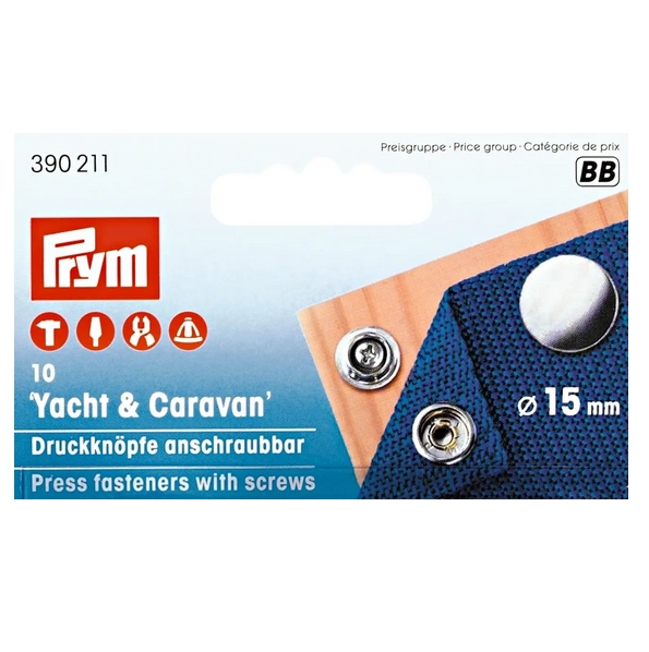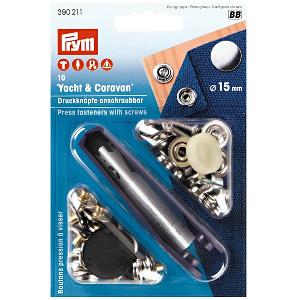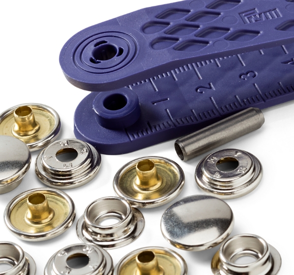 The silver-coloured press fasteners have a diameter of 15 mm. Instructions are in the pack.