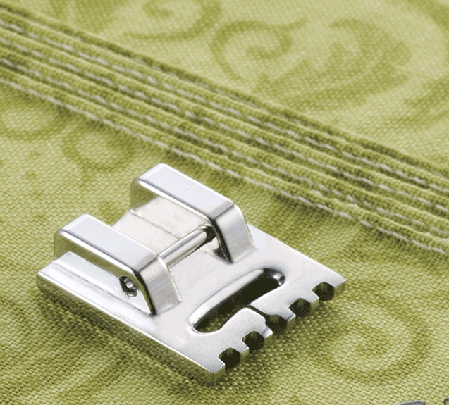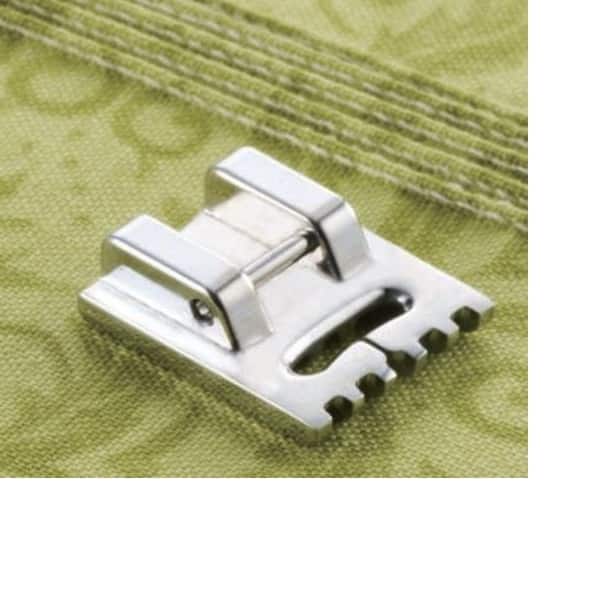 This presser foot has 5 grooves and produces perfect pin tucks and corded pin tucks using a twin needle on lightweight fabric.