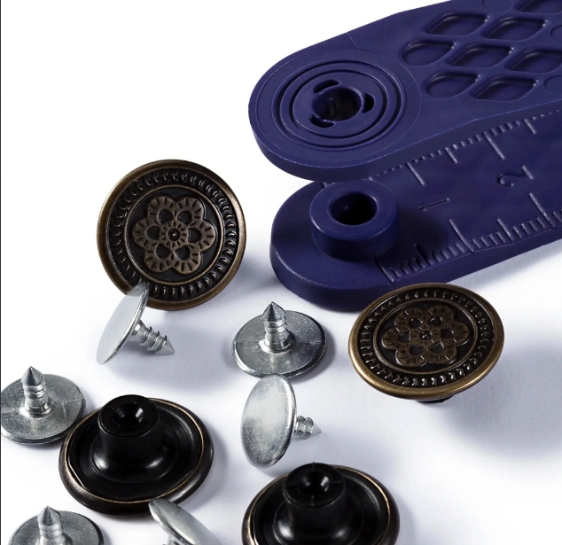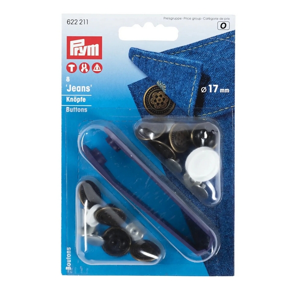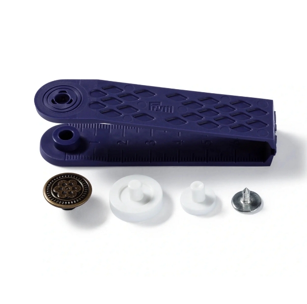The Prym jeans buttons are designed specifically for use on denim jackets, denim shirts and jeans trousers. Regardless of whether it is cult, casual or modern: The numerous models of jeans buttons leave nothing to be desired. The flower for kids jeans, the American-style for a cool look or would you rather without any motif? Here you will find everything that you need! The non-sew buttons can be mounted either with the tool and a hammer, the VARIO pliers for non-sew products or the tripod mount. Since the jeans buttons are made of stainless brass, they can of course be washed at 60 degrees and dry cleaned.