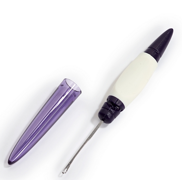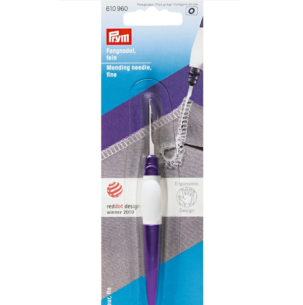 This fine mending needle from the prym.ergonomics series is impressively versatile, because it can be used for picking up and repairing stitches in knitted goods, inserting threads and as a thread-guide in overlock machines. A ladder in a nylon stocking or a dropped stitch in your knitting? Securing the thread neatly when overlock sewing? No problem for this mending needle, with its ergonomic design features such as the anti-slip recessed grip, which make for fast, effortless work. The mending needle is supplied with an end cap, which you can attach to extend the handle.
