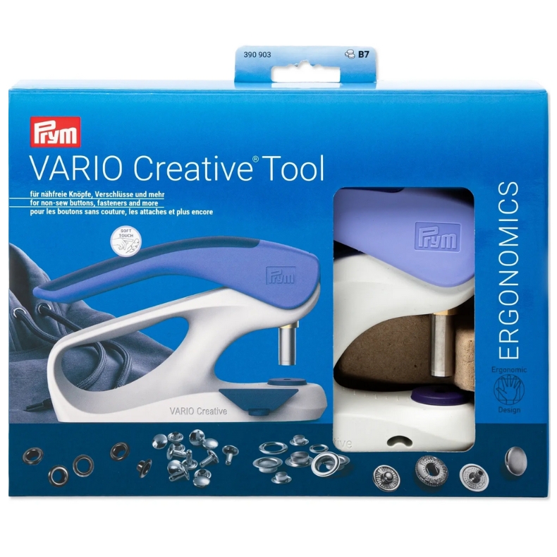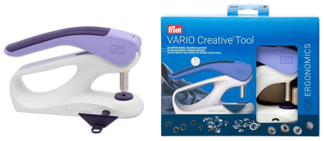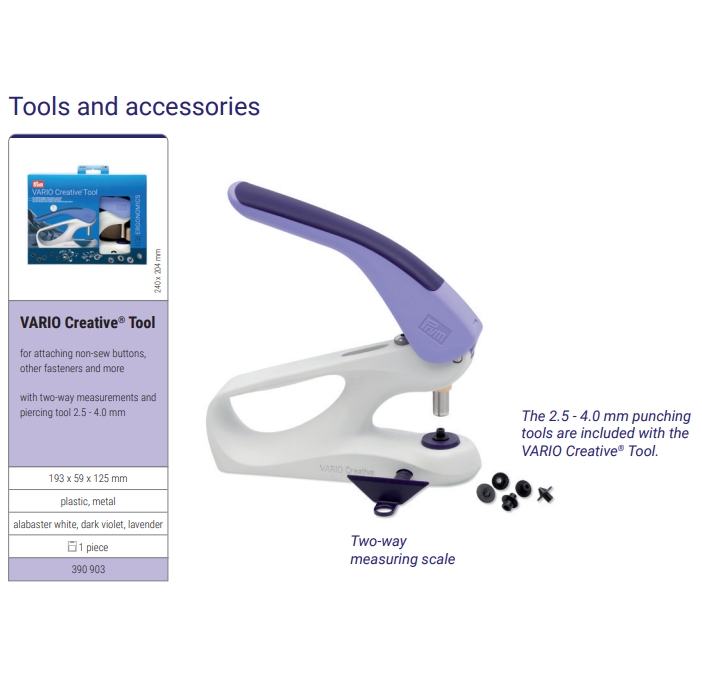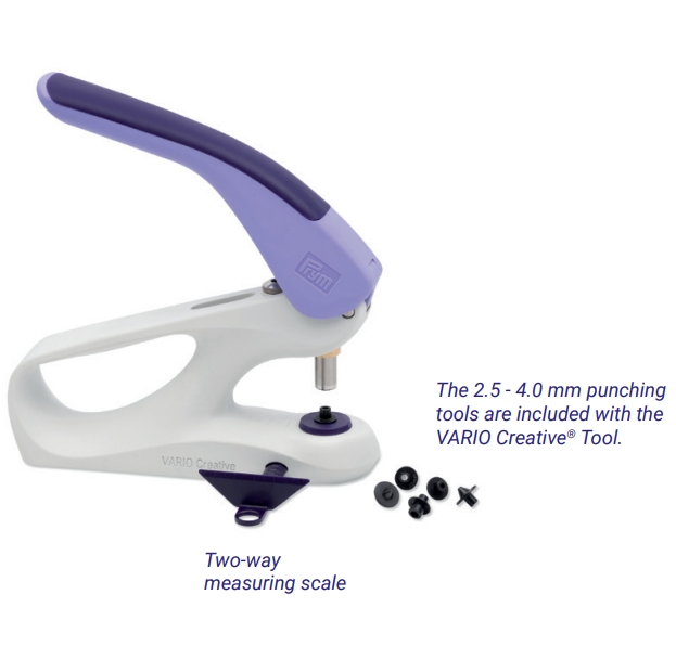 VARIO Creative® Tool je kompatibilan sa svim postojećim Prym setovima alata iz asortimana. Mali napor koji je potreban i jednostavno prebacivanje između različitih funkcija omogućuju precizan rad bez zamora uz sigurnost uspjeha. Ljestvica s uzdužnim i poprečnim mjerenjima vrlo je praktična za održavanje fiksnih udaljenosti na tkanini / materijalu koji se obrađuje. Uključeni su i alati za bušenje od 2,5 do 4,0 mm.