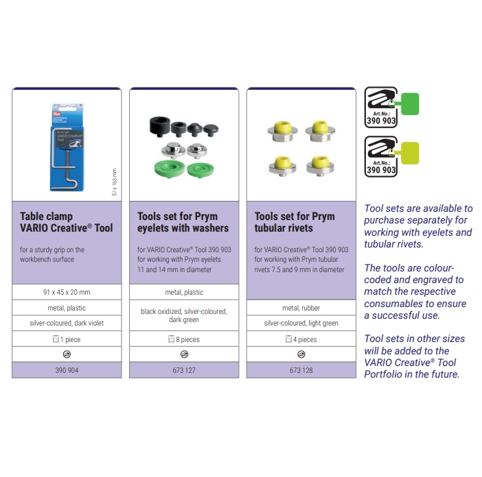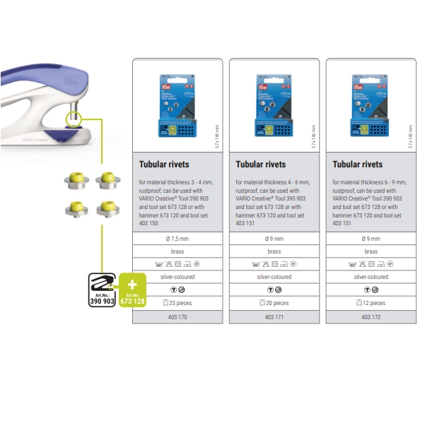 Zasebno su dostupna dva seta alata za obradu Prym ušica s diskovima od 11 i 14 mm (br. art. 673127) kao i za Prym šuplje zakovice od 7,5 i 9 mm (br. art. 673128).
