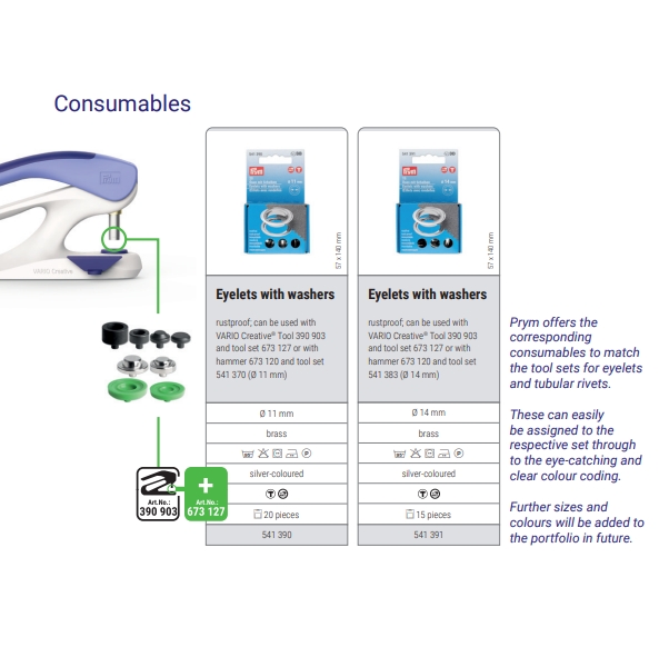 Pojedinačne boje kompleta alata pokazuju put do novih potrošnih materijala pakiranih također bez plastike s istim kodom boja: 2 varijante Prym ušica s diskovima 11 i 14 mm (br. art. 541390 / 541391) ili 3 varijante Prym šupljih zakovica, ovisno o debljini materijala koji se obrađuje od 3 do 9 mm (art.br. 403170 / 403171 / 403172).